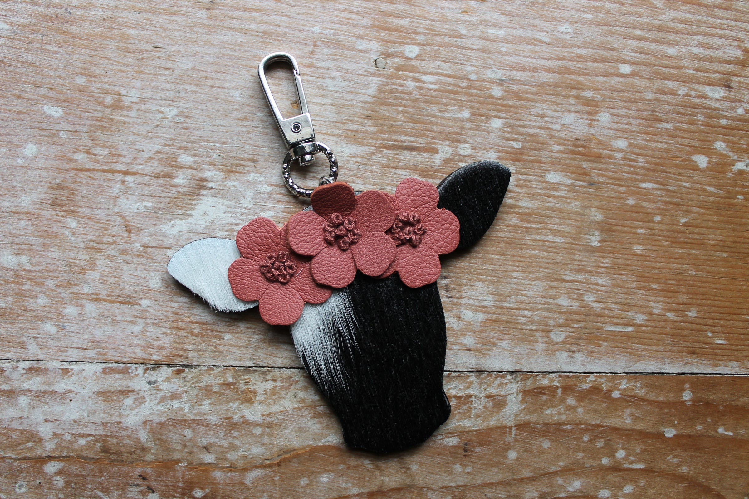 -- Black and white cowhide heifer with salmon pink leather flower crown