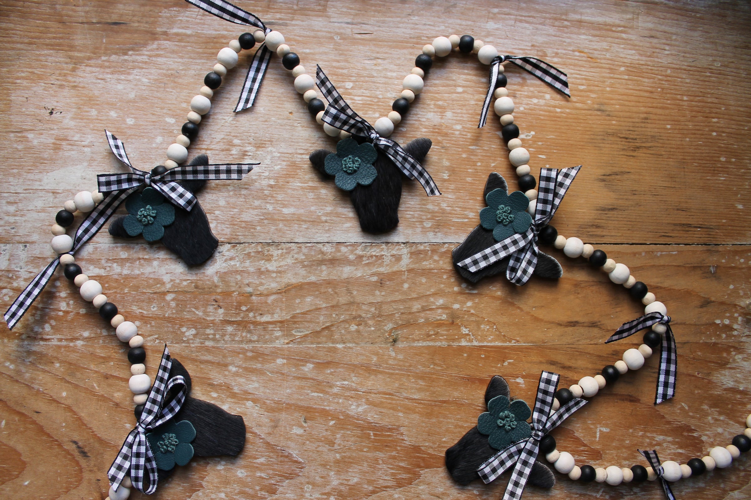 -- Garland measures 4 ft in length with loops to hang, heifers measure 2 x 3 inches