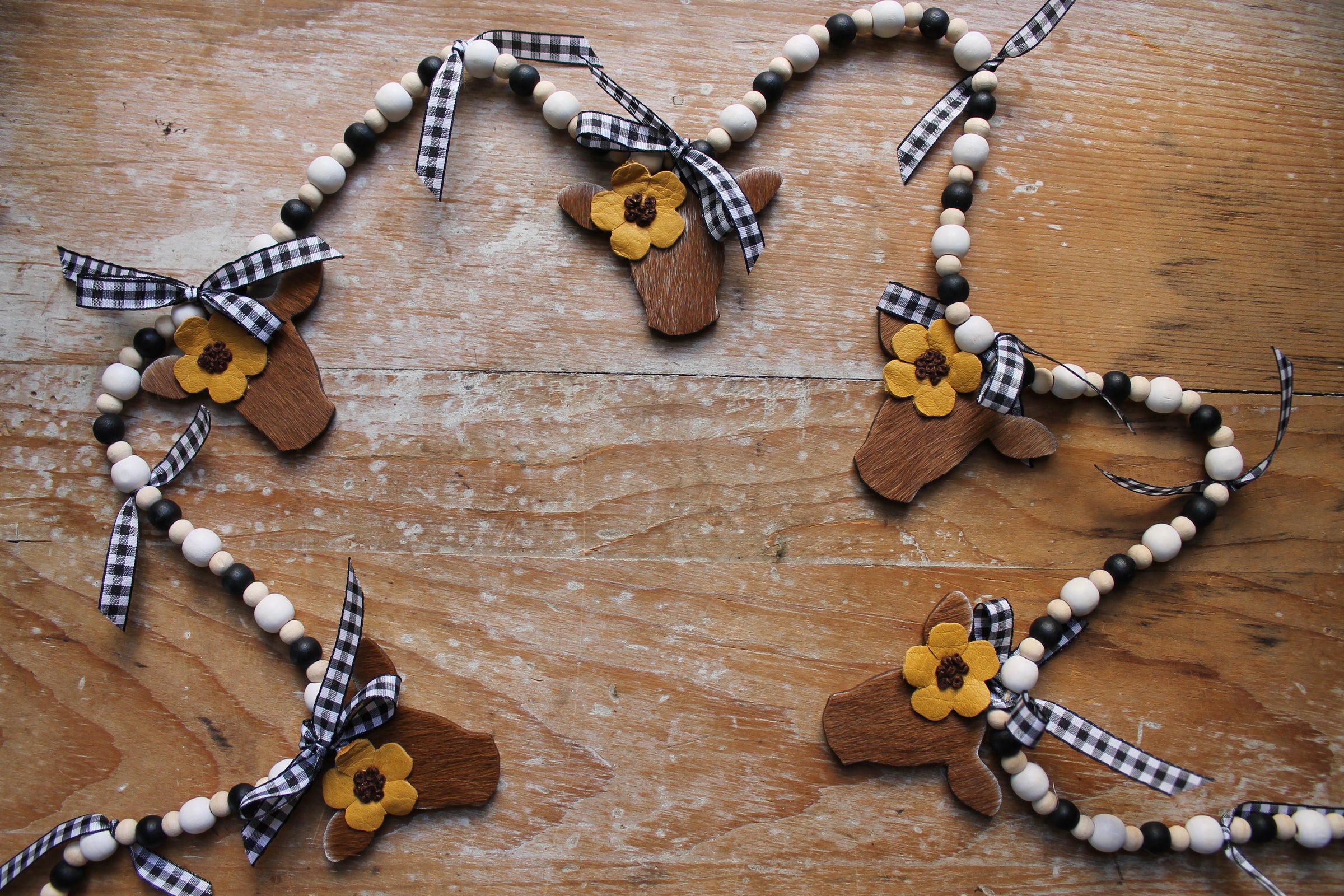 -- Garland measures 4 ft in length with loops to hang, heifers measure 2 x 3 inches