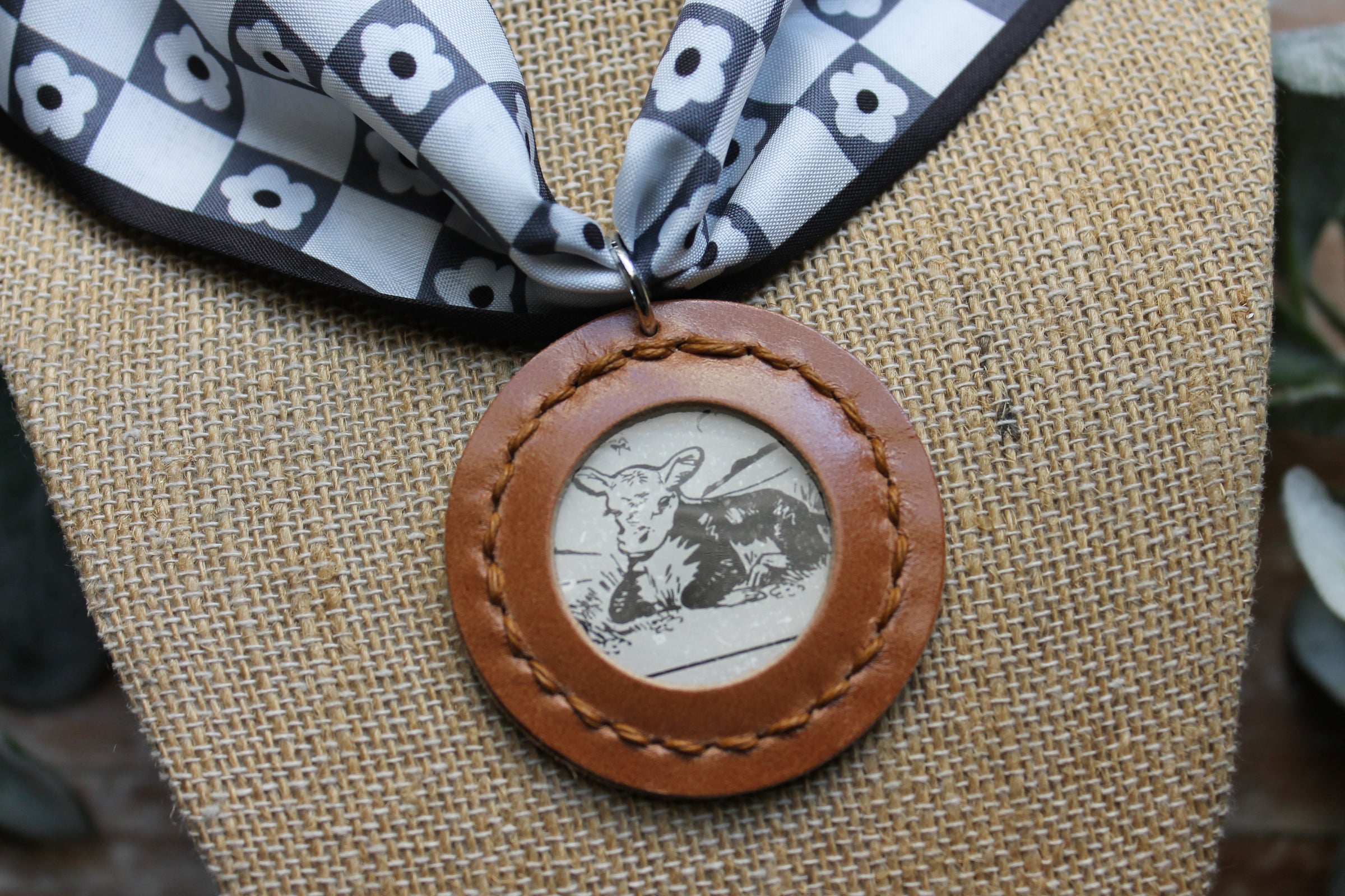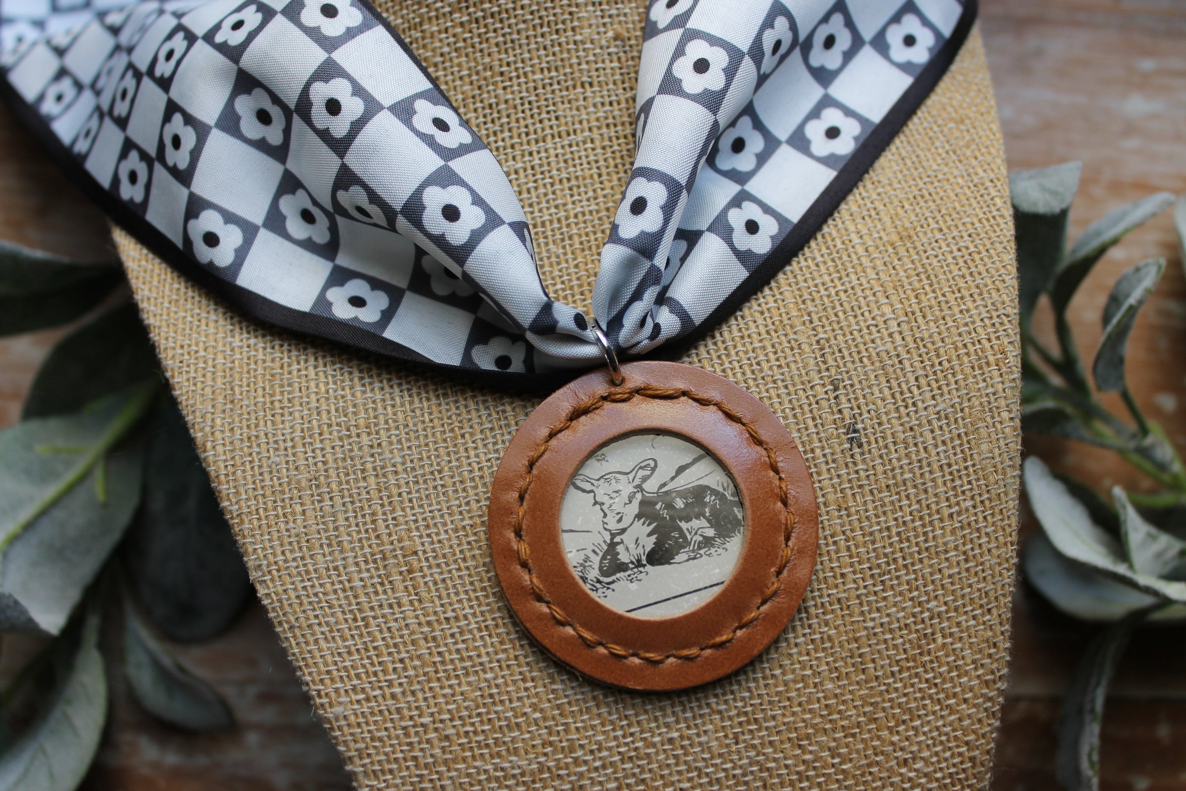 -- Vintage print ad piece from an American Hereford Journal (1940s-1960s issues) inlayed into a leather pendant hanging from a black and white checkered flower scarf, which is adjustable in length depending on how you tie it. The pendant can also be interchanged to your own scarf.