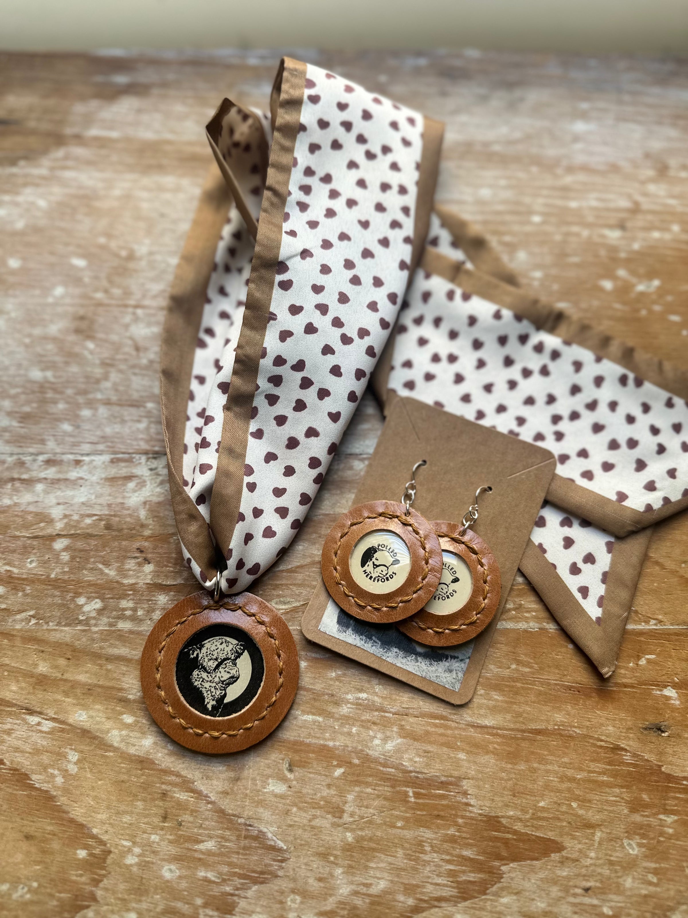 Brown heart scarf with “polled Hereford” pendant (earrings shown as example of logo)