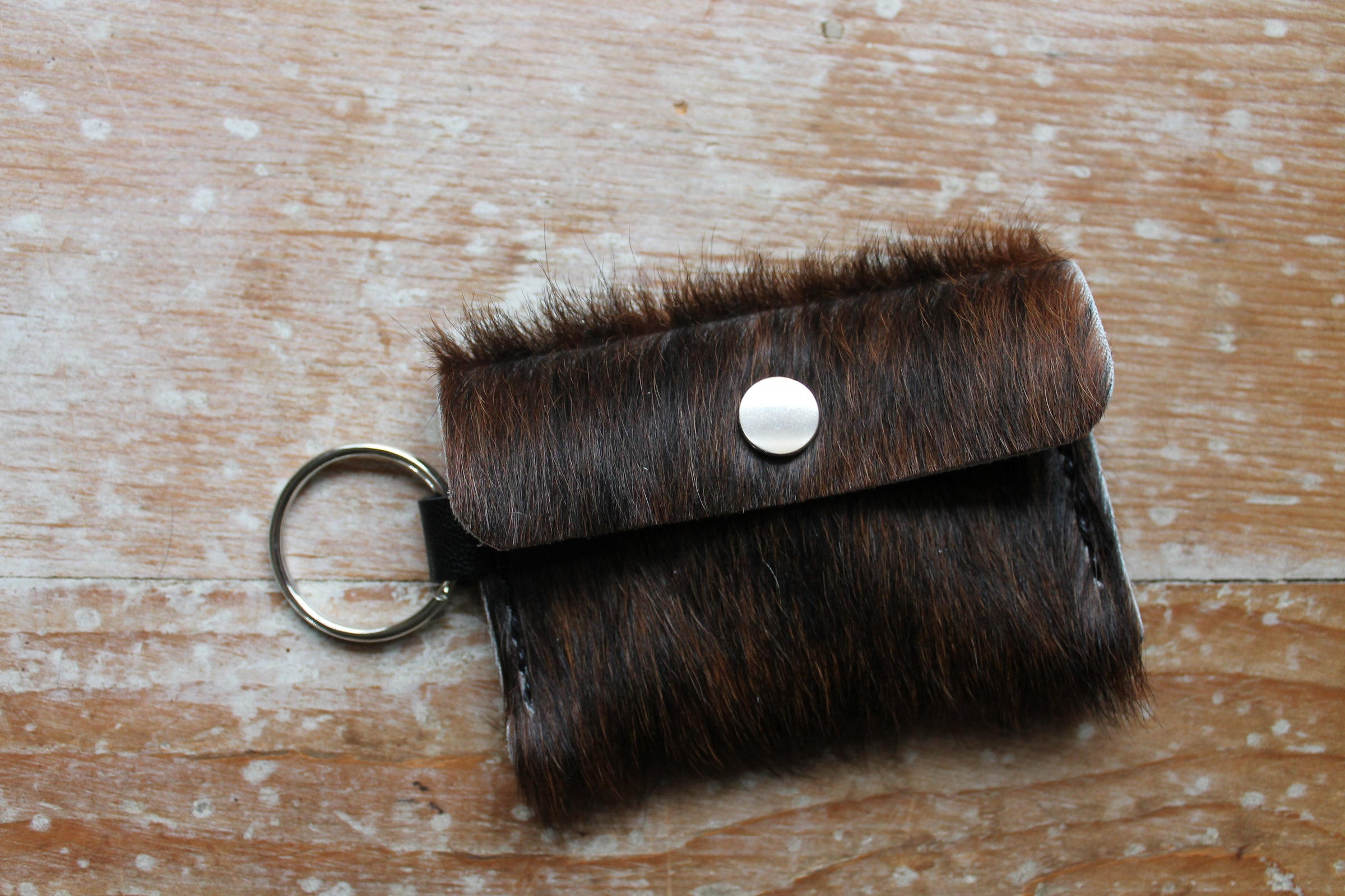 -- 1.25 inch split keyring sewn into side of pouch, snap closure
