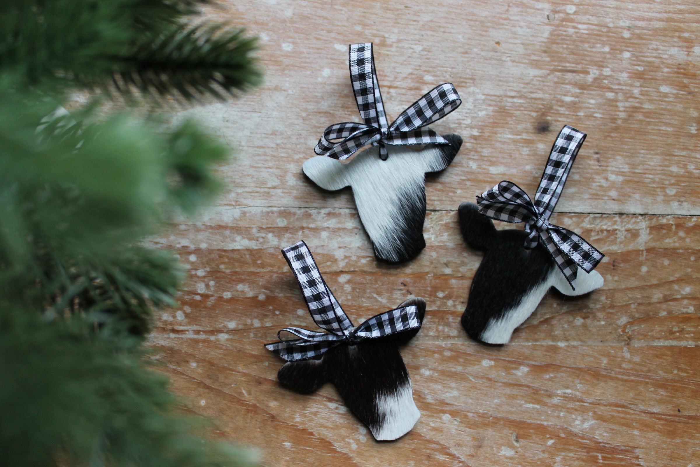 Celebrate your love of black and white cows by decorating for the holidays with mini cowhide ornaments!