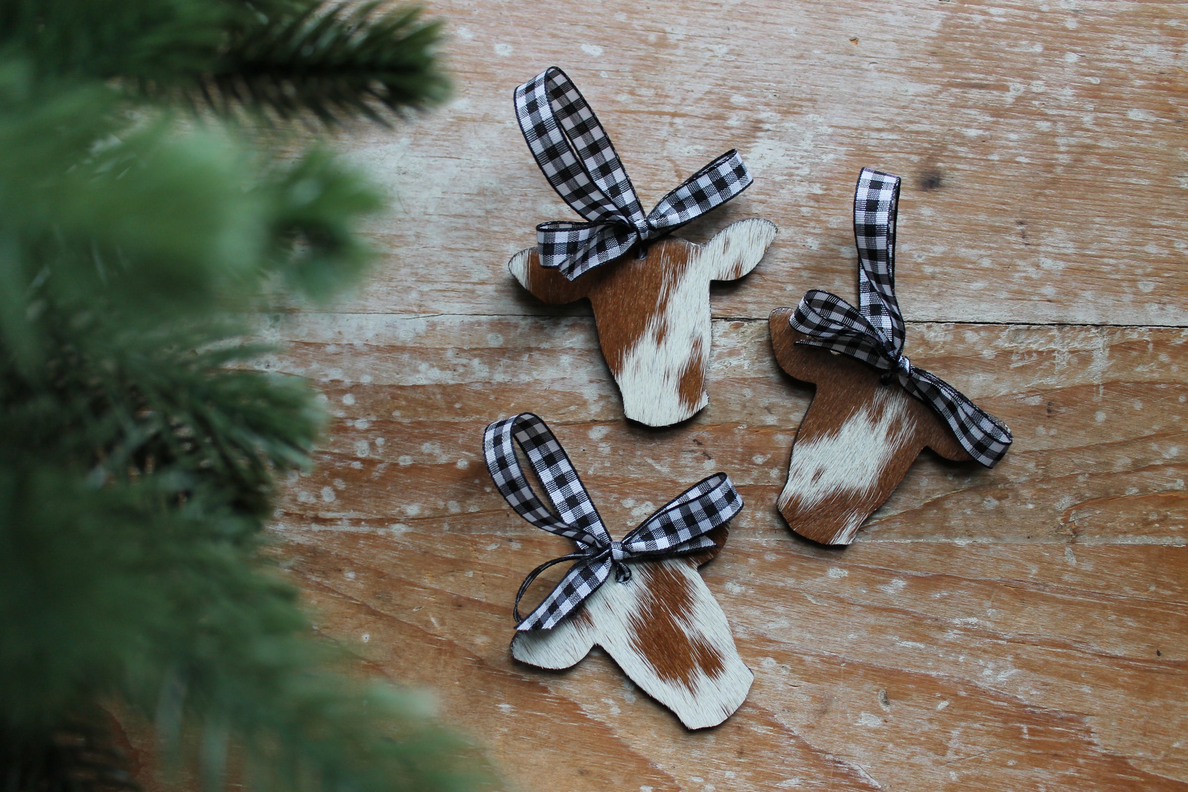 Celebrate your love of red and white cows by decorating for the holidays with mini cowhide ornaments!