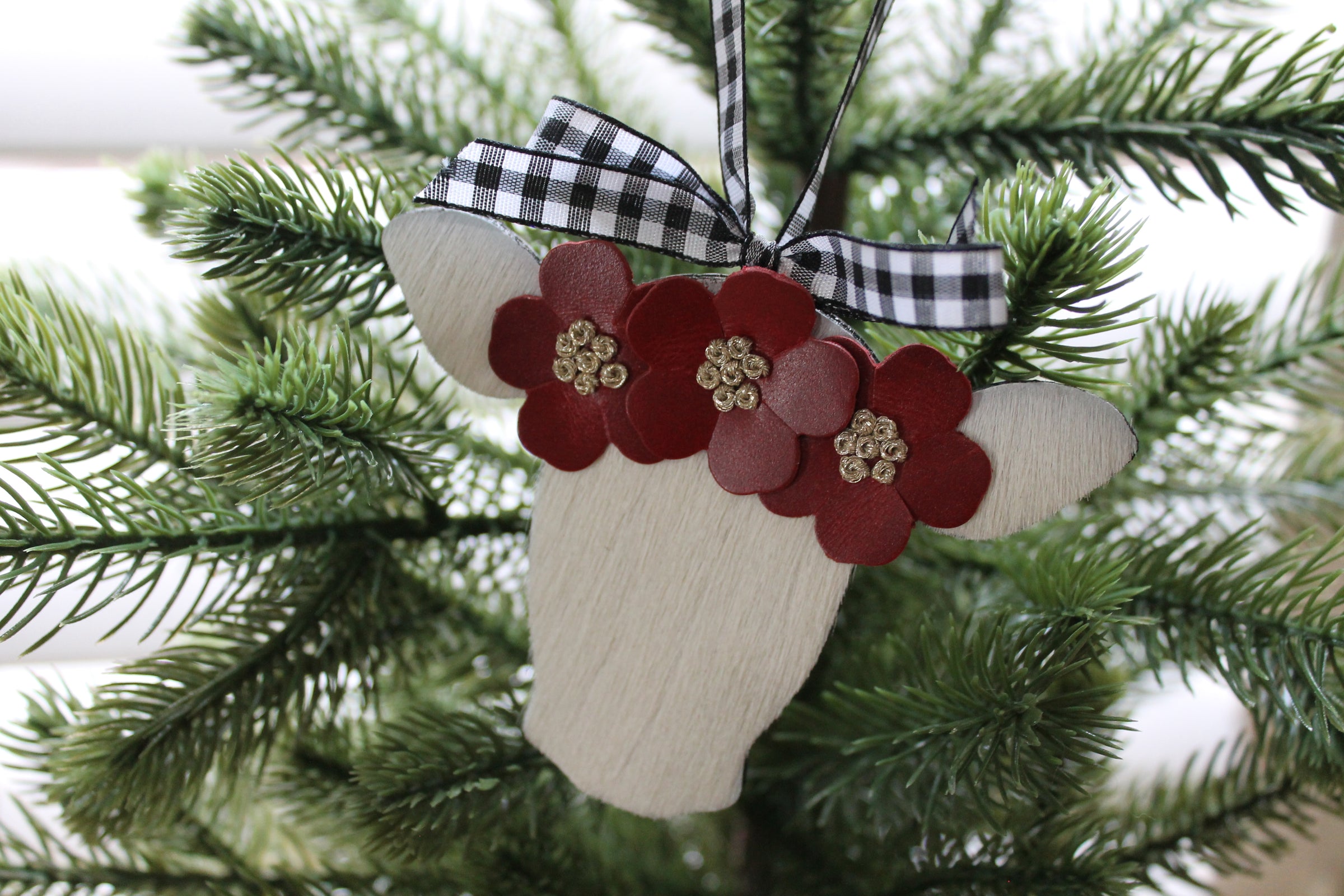 -- White cowhide heifer ornament with red leather poinsettia flower crown and gold hand embroidered french knot centers