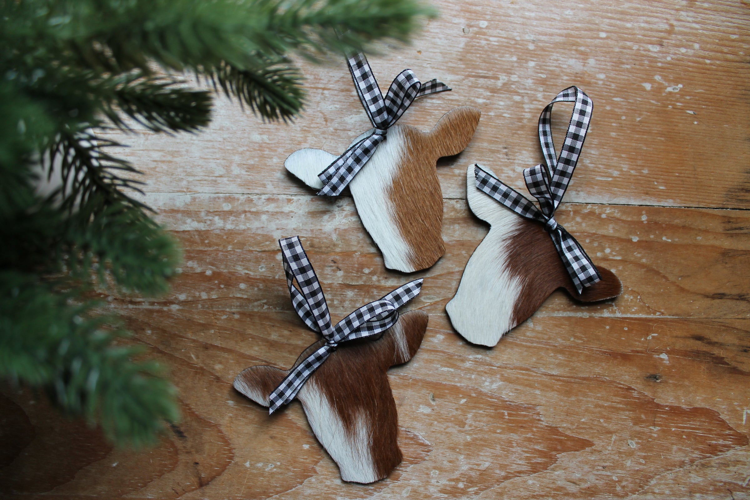 Celebrate your love of red and white cows by decorating for the holidays with cowhide ornaments!