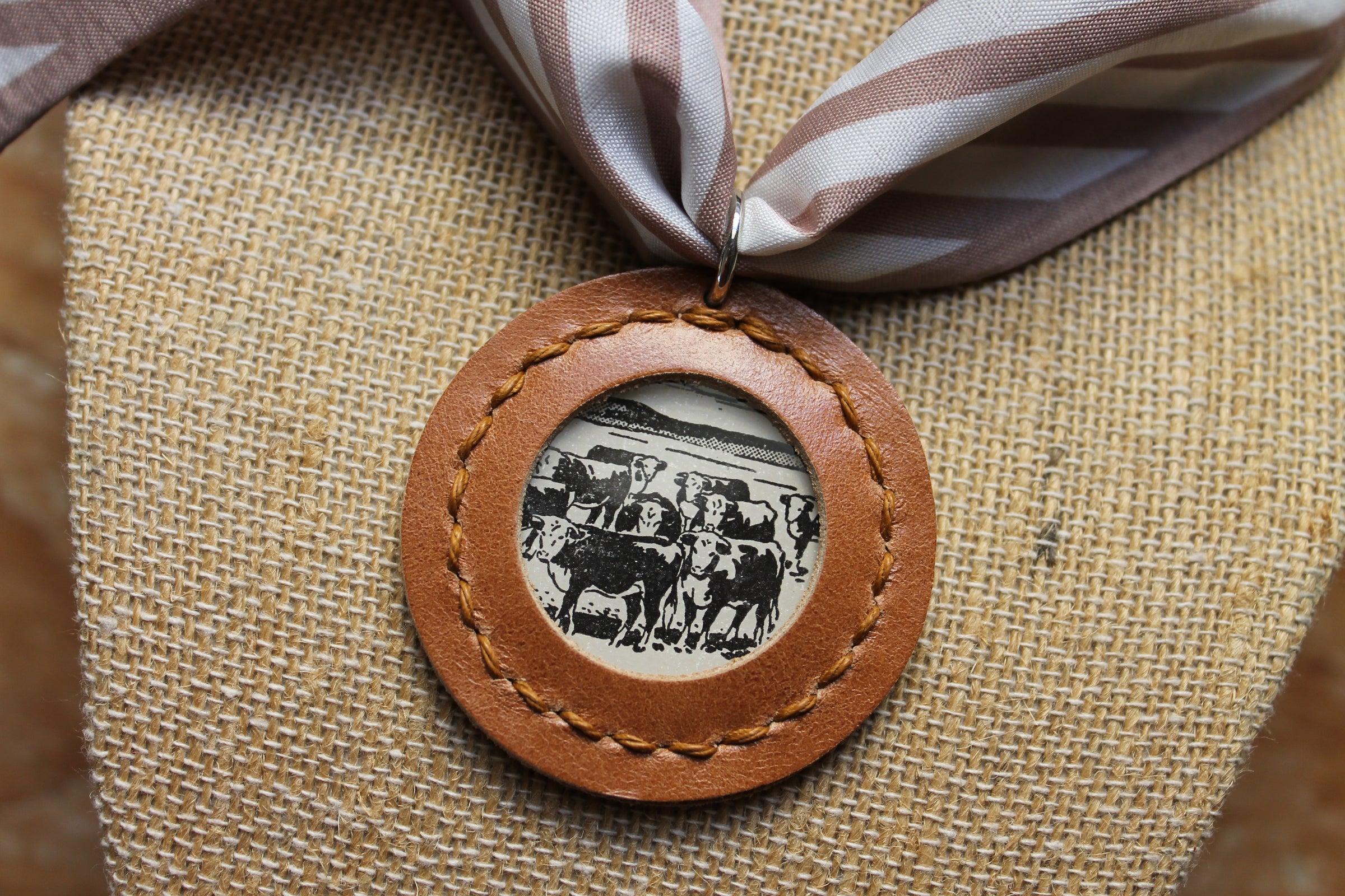 -- Vintage print ad piece from an American Hereford Journal (1940s-1960s issues) inlayed into a leather pendant hanging from a mocha and white striped scarf, which is adjustable in length depending on how you tie it