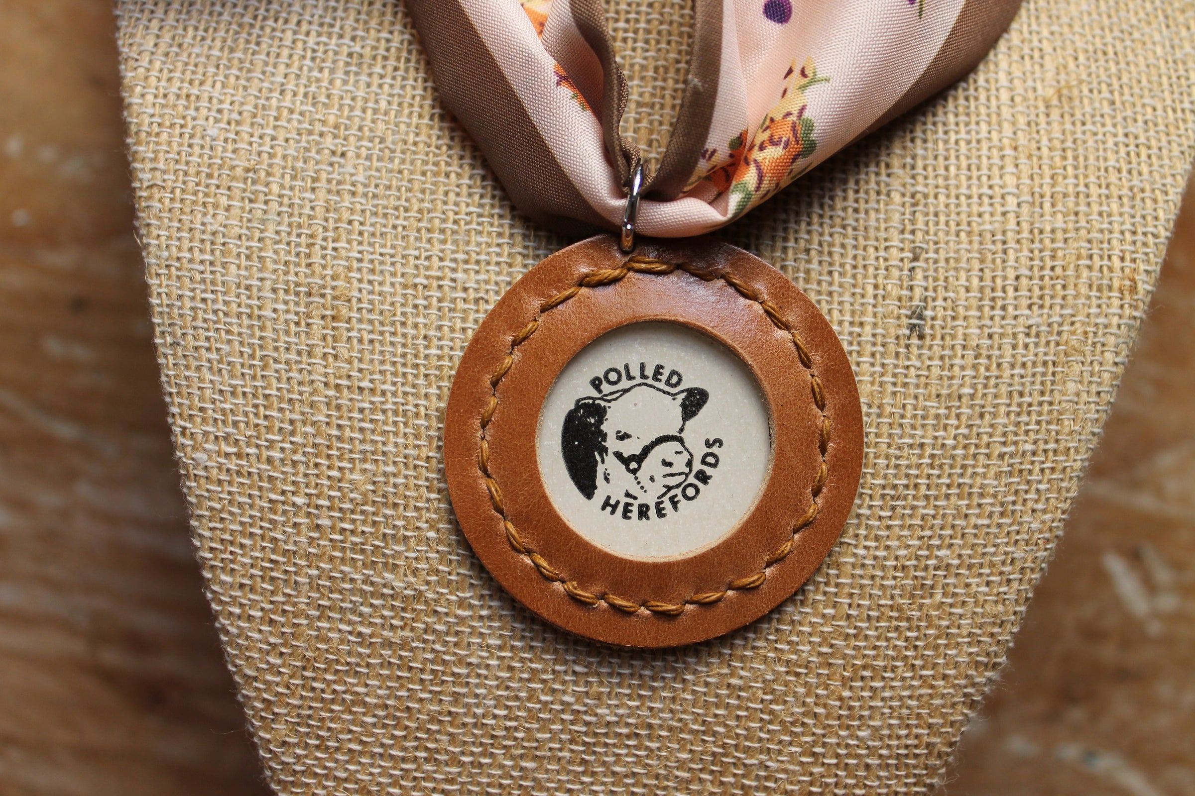 -- Vintage print ad piece from an American Hereford Journal (1940s-1960s issues) inlayed into a leather pendant hanging from a peach and mocha floral scarf, which is adjustable in length depending on how you tie it